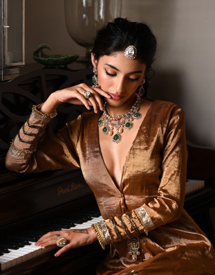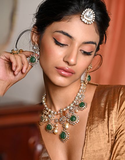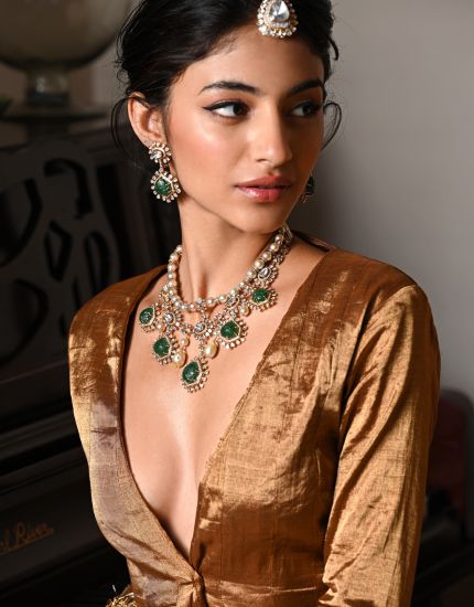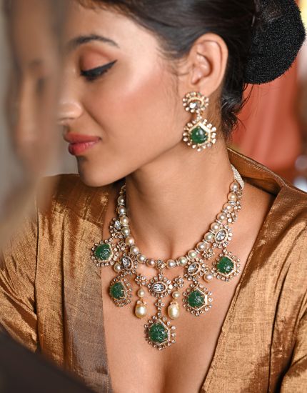The necklace features lustrous syndicate polkis interspersed with rich Zambian emeralds, creating a striking contrast of brilliance and color. The emeralds, encased in delicate polki frames, add a regal touch, while pearl drops lend a graceful fluidity to the design.