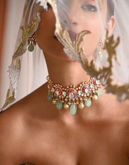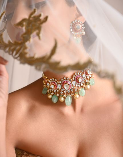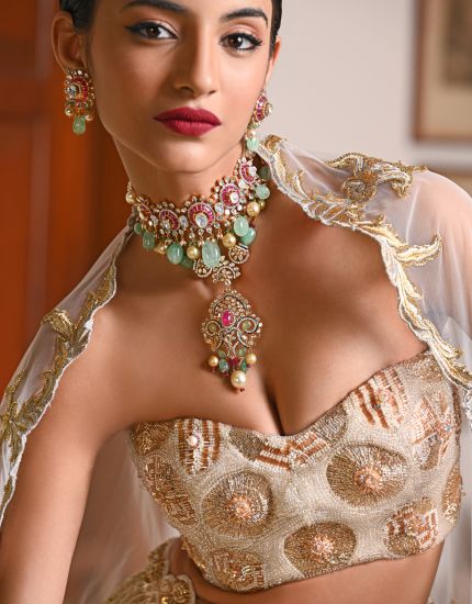 The top choker piece is adorned with intricate floral motifs, encrusted with syndicate polkis and accented with vibrant high quality ruby cut stones. The delicate arrangement of pastel green russian emeralds lends a refreshing contrast, while dangling pearls and golden beads add graceful movement, enhancing the regal allure.