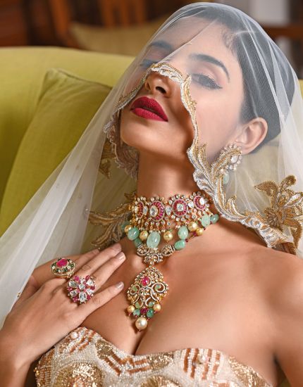 Beneath it, the longer necklace features a statement pendant, showcasing meticulous craftsmanship with ornate polki work and gemstone embellishments. The interplay of colors, textures, and layers creates a mesmerizing visual symphony, making this ensemble a true embodiment of luxury and timeless elegance.