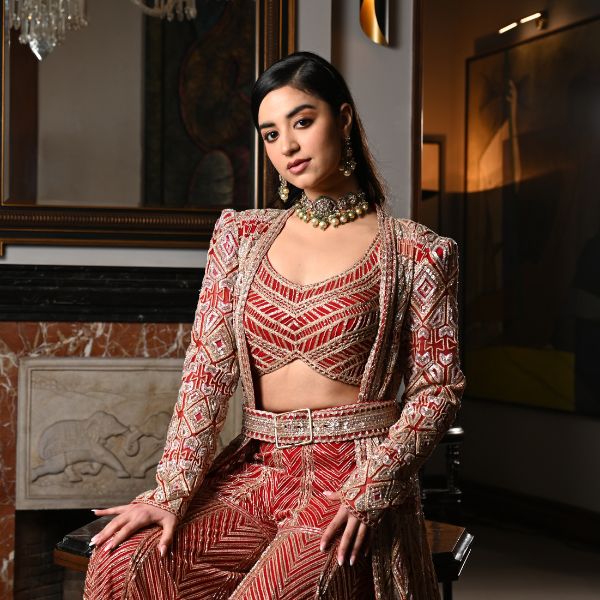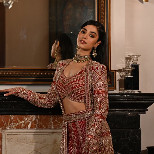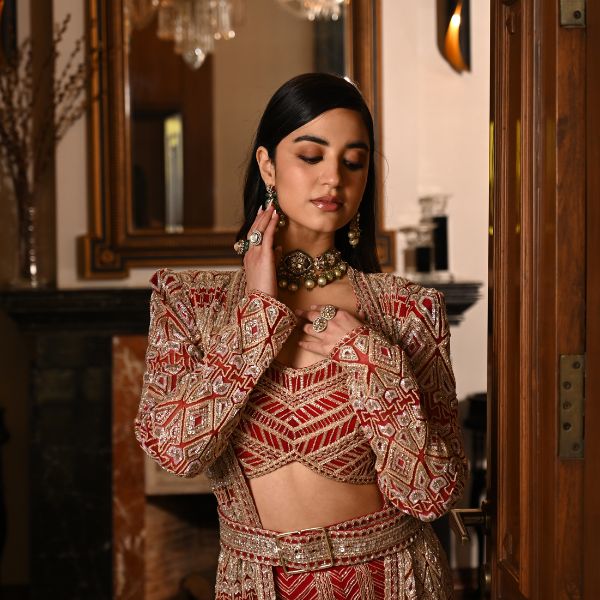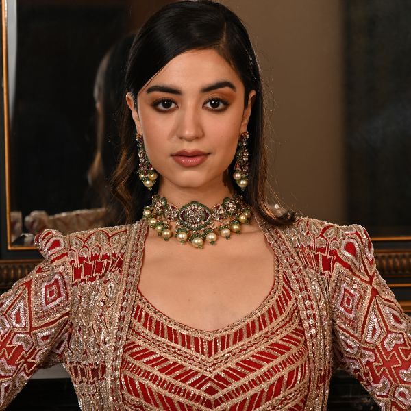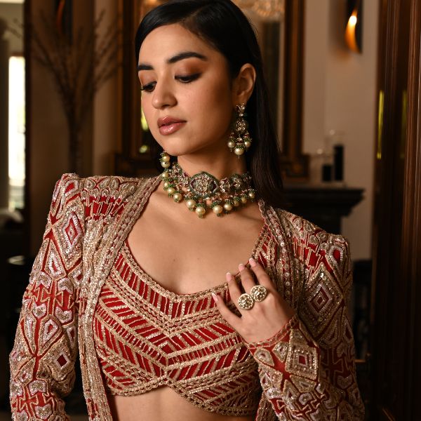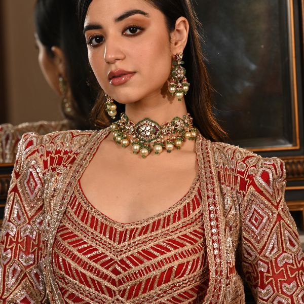 This exquisite choker set is a harmonious blend of traditional elegance and contemporary allure. Designed with all syndicate polkis in an open setting, it showcases the raw, uncut brilliance of the diamonds. The choker is adorned with lush Zambian emeralds, creating a striking contrast against the shimmering polkis. Real pearls in soft ivory hues, delicately dangling, add fluidity and grace to the piece.