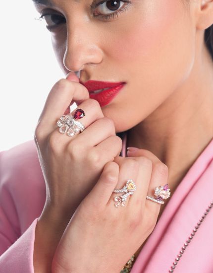 The band is lined with precision-set baguette diamonds, adding a layer of architectural elegance to the organic floral form. The interplay of sharp geometry and fluid curves gives Ember Kiss a modern edge, while still rooted in timeless romance. It’s a piece made for someone who carries warmth and allure in their presence — a radiant reminder that even the softest spark can light up everything around it.