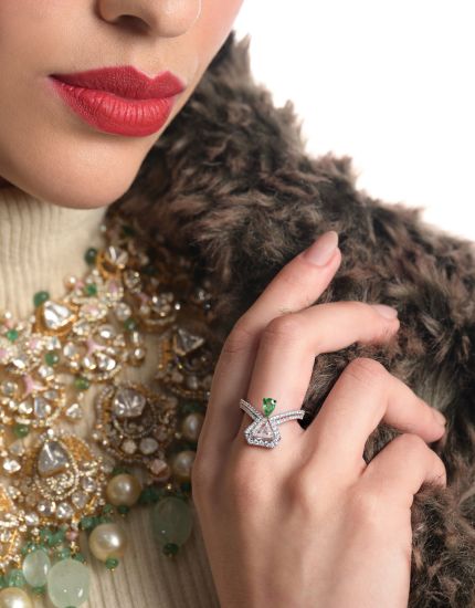 features a geometric design with a triangular rose-cut diamond encased in a diamond studded frame, with the focal point of emerald on top. Its openwork structure creates an elegant hourglass silhouette.