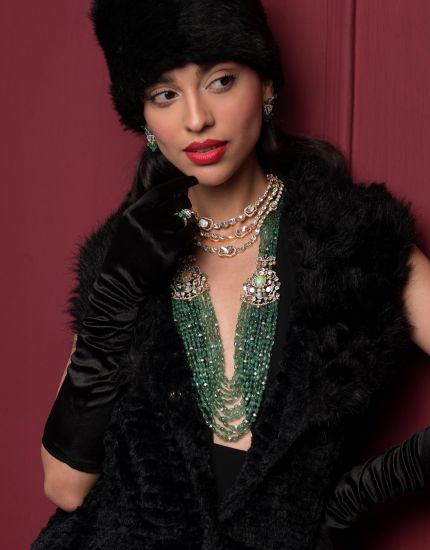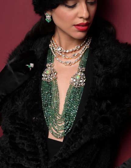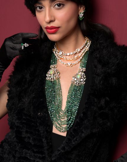 Paired with a refined choker of uncut polkis and diamond details, this ensemble embodies sophisticated grandeur with a contemporary twist.