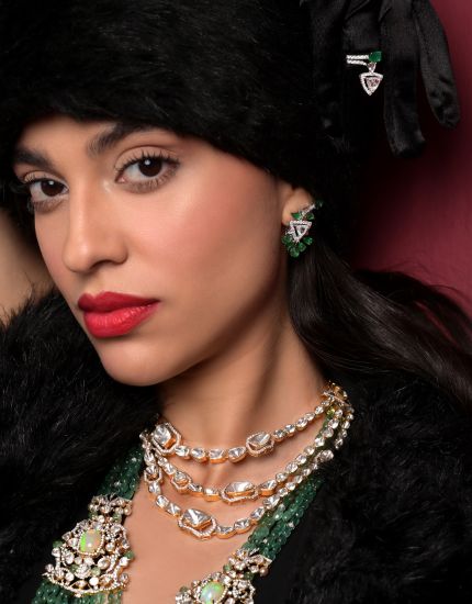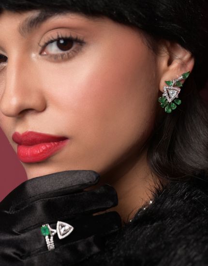 Designed as a fusion between Mughal grandeur and organic ivy-like flow, the trillion Rosecut diamonds form the central focal point in these earrings.