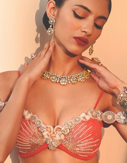 Completing the look are bold polki rings, adding a final flourish of sophistication to this breathtaking ensemble.