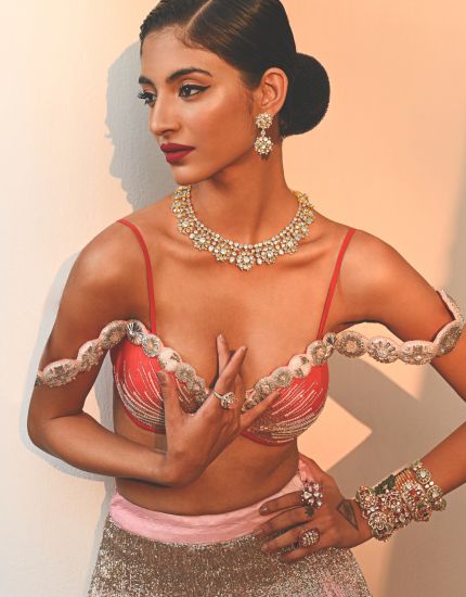 The matching earrings mirror the necklace’s design, with uncut diamonds forming a floral motif, adding a soft, feminine touch. The standout element is the stack of polki kadas and bangles, adorned with intricate detailing, pearls, and pastel accents, creating a layered statement of regal grandeur.