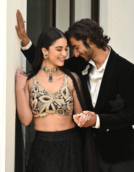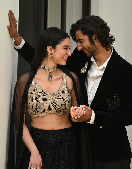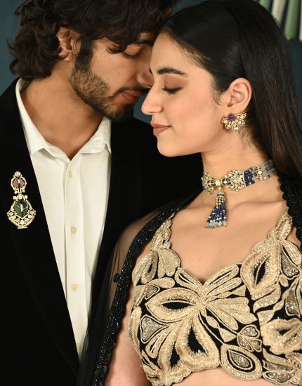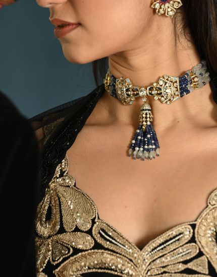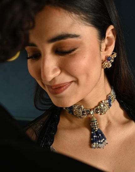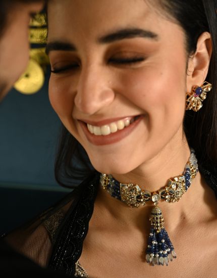 This striking choker set is a fusion of regal elegance and contemporary flair. The choker features all syndicate polkis in an open setting, highlighting the uncut diamonds’ natural brilliance. The piece is accented with deep blue sapphire beads, creating a bold contrast against the shimmering polkis. The centerpiece tassel, composed of sapphire beads and real pearls, adds graceful movement and a touch of drama.
