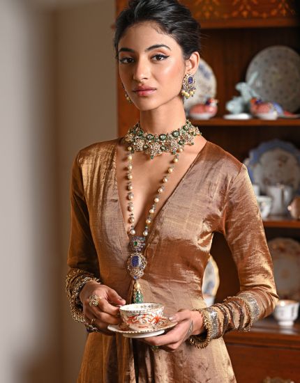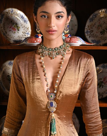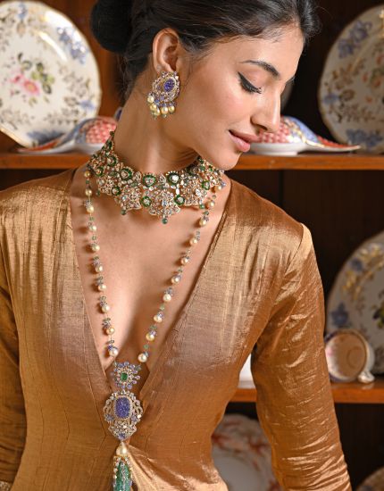 The longer necklace adds a dramatic flair with its pearl and emerald bead string, leading to a striking pendant. The pendant showcases an ornate design with a royal blue tanzanite center, encircled by polkis and emerald details, while tassels of emerald beads add graceful movement.
