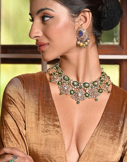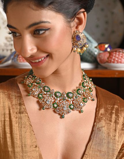 The choker features intricate floral motifs crafted with syndicate polkis, highlighted by rich Zambian cut stones. The delicate arrangement of uncut diamonds and green accents creates a regal yet refined look.