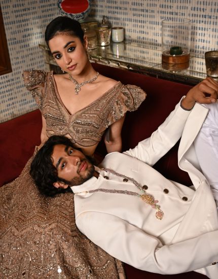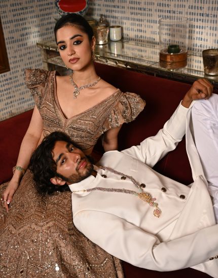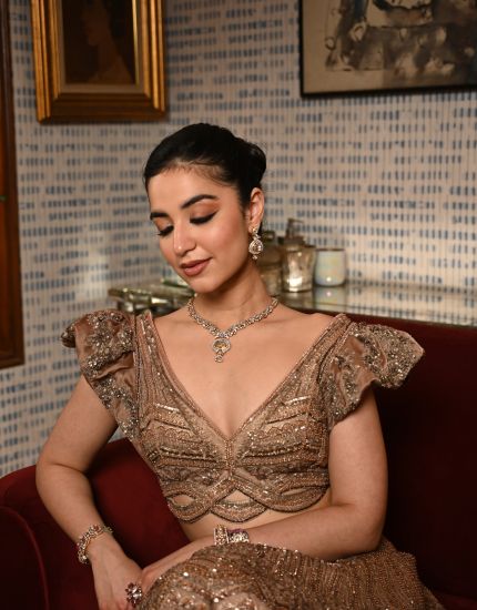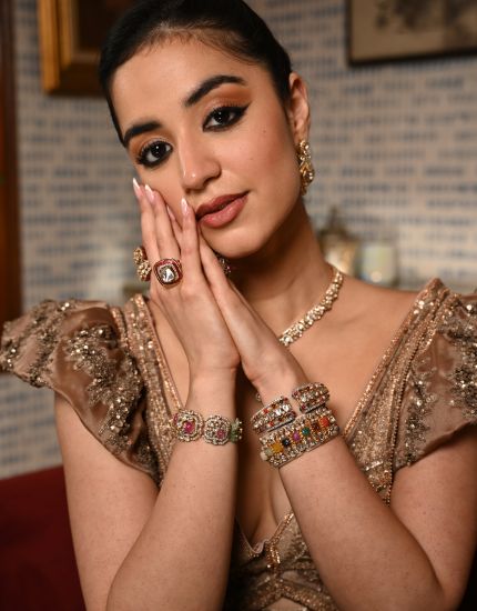 The matching earrings mirror the necklace’s design, featuring teardrop polkis and diamond accents, while the bracelet and ring introduce a vibrant touch with rubies and emeralds, creating a striking contrast. Set in 14k gold, this ensemble is the epitome of understated luxury, perfect for modern festivities and elegant soirées.