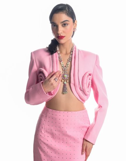 This exquisite long necklace is a striking blend of regal elegance and contemporary allure. The pendant features a magnificent opal at its center, surrounded by all syndicate polkis in an open setting, allowing the uncut diamonds to shine with raw brilliance. The intricate detailing is accentuated with diamond embellishments and ruby baguettes, adding a delicate charm.