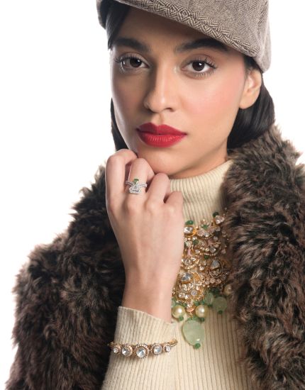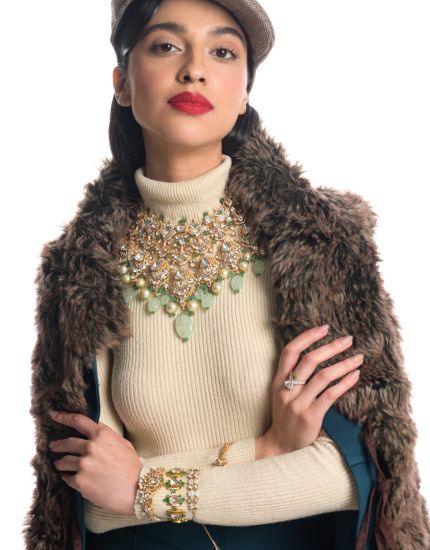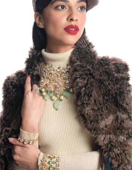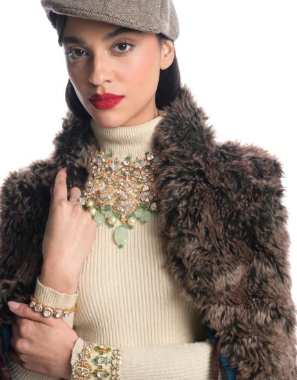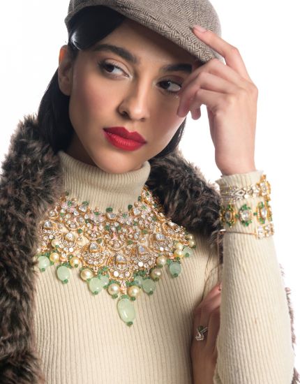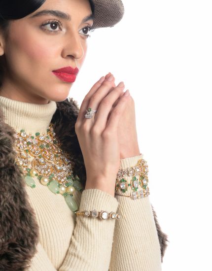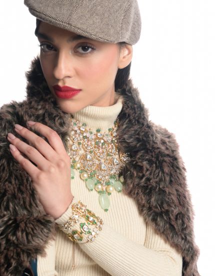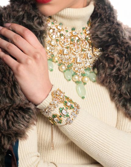 Dangling golden South Sea pearls and pastel russian emerald lend a graceful movement to the piece, while small zambian emerald beads add a touch of richness. The matching cuff bracelets, embellished with polkis, emeralds, and diamonds, complete the regal ensemble. Set in 14k gold, this luxurious set embodies majestic elegance, making it perfect for grand occasions and couture fashion moments.